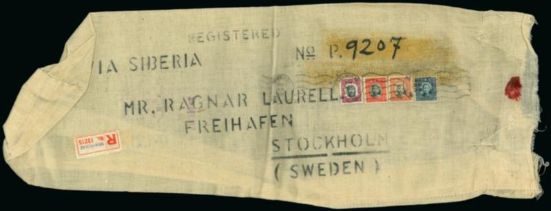 1924 (23 May) Letter from Harbin to Vienna, bearing on back block of four and a single 5c rose mauve Junk series, all stamps tied by circular Harbin ds, endorsed “Via Russia, Registered” and carrying Harbin numbered reg. label on front; one stamp struck by Moscow transit pm (consignor’s note: “this kind of postmark was used when the OGPU (Soviet secret service) paid more attention to letters from China with Russian names”). (Image)