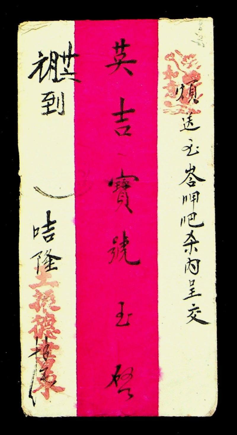 China 1890 stampless Red Band cover written in native script w/ "Mallaca" Malaya cds at back (Image)