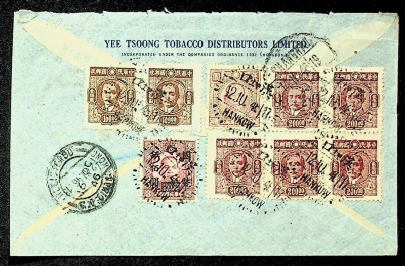 China 1946 Sun Yat-Sen 9v on Tobacco Distributor Regd airmail cover from Hankow via Shanghai/ Hong Kong w/ "By Air to London only" cachet to Austria (Image)