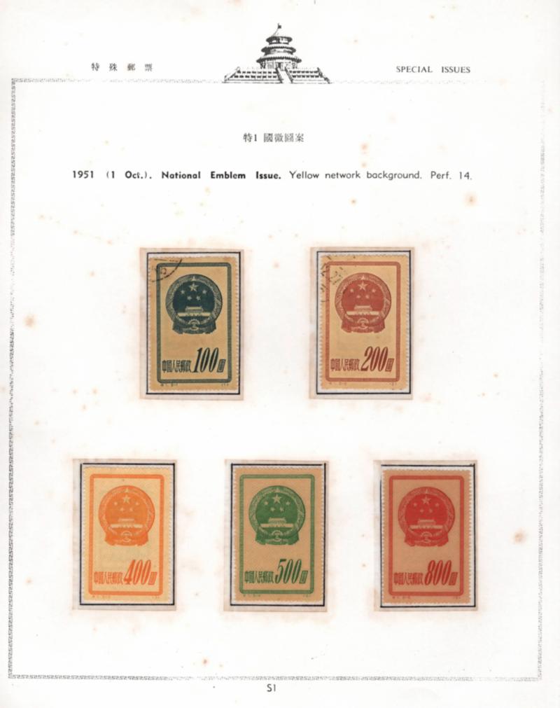 China 1951 (1 Oct.). National Emblem Issue. Perf. 14. 5 used + mint stamps (Image)
