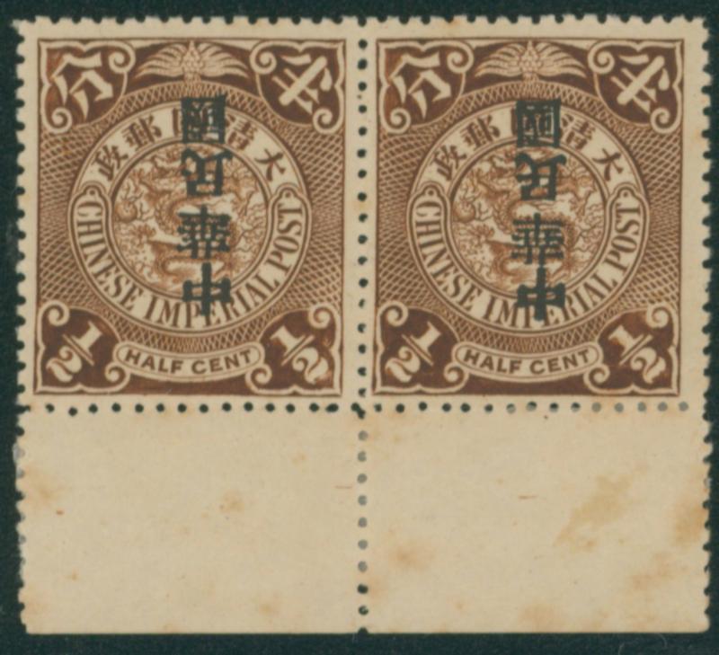 China 1912 The engraved Coiling Dragon "Republic of China" overprints. Statistical Department Overprints 1/2c. pair. Overprint inverted. unused stained, (Image1)
