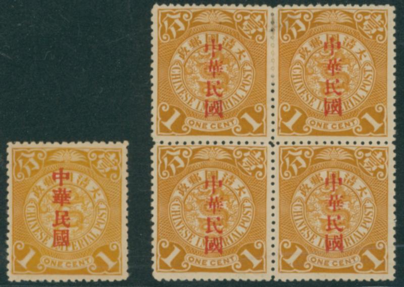 China 1912 The engraved Coiling Dragon "Republic of China" overprints 1c. Brock of four is Commercial press. Overprints with Large "Kuo". unused hinged, (Image1)