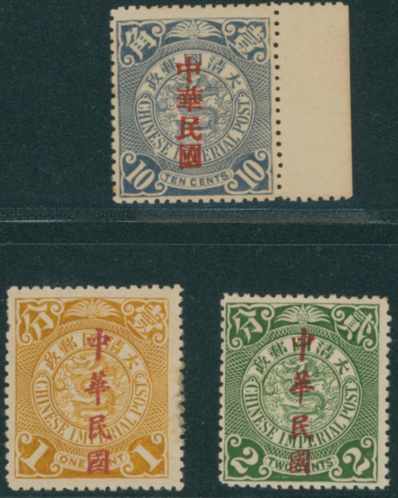 China 1912 The engraved Coiling Dragon "Republic of China" overprints. Statistical Department Overprints 10c., Waterlow and Sons overprints 1c. and 2c. unused hinged, (Image1)