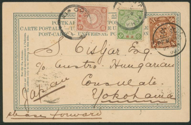 China 1900 4f Peking cancelled 1900.3.27 and 1900-1907 Japanese post office in China 1 Sen, 2 Sen franked cancelled by roman letter cancellation with 2 digit in black 1900-04-? Shanghai to Yokohama (Image1)