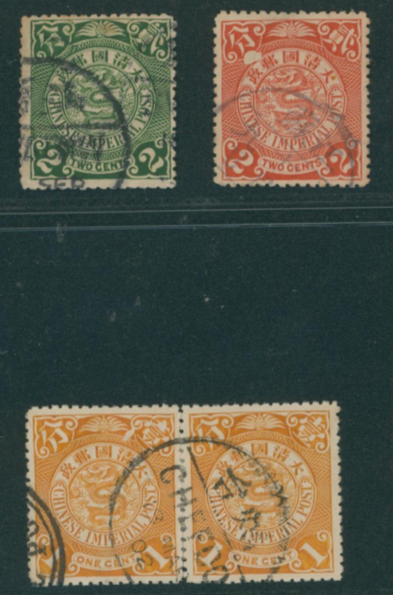 China 1898-1910 Engraved Coiling Dragon 2c.(2) and 1c. pair Accidental Variety used (Image1)