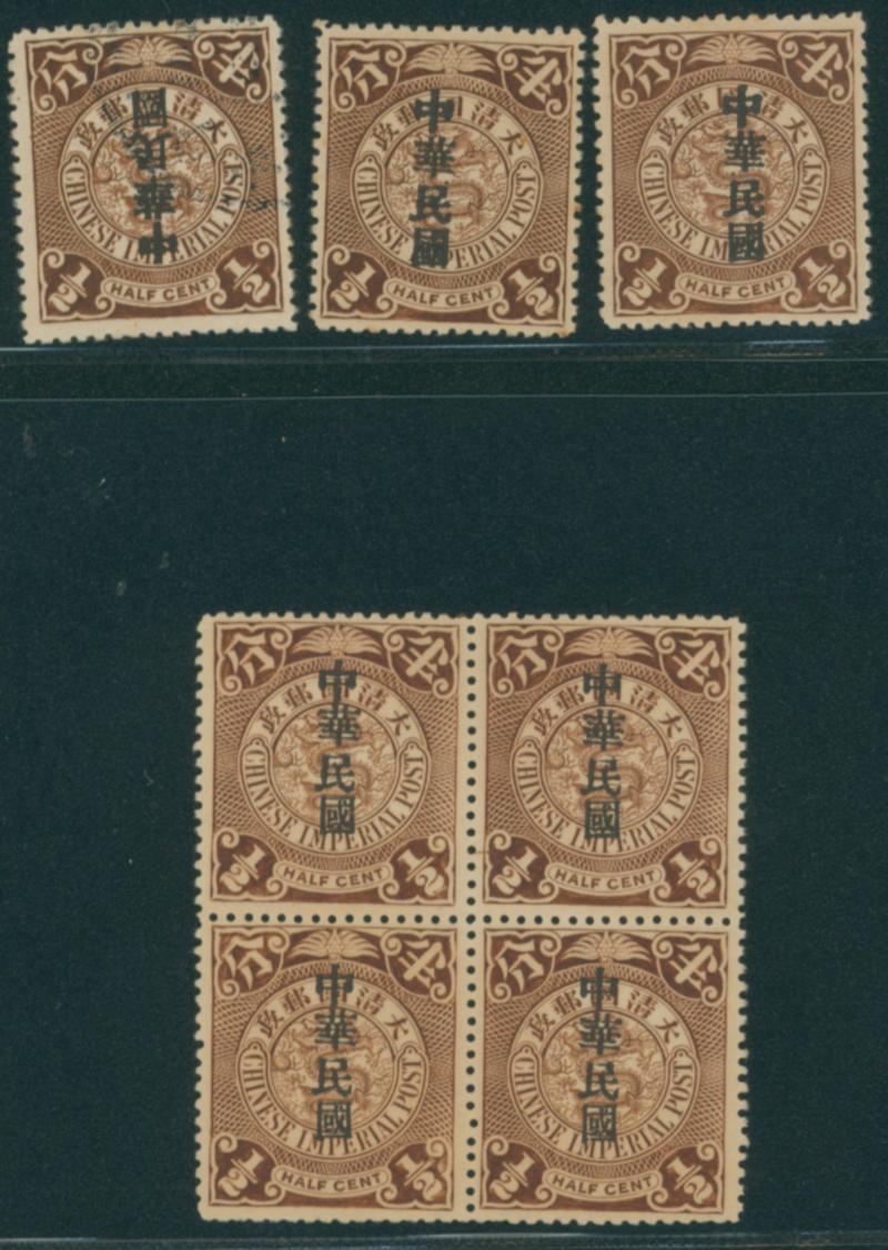 China 1912 The engraved Coiling Dragon "Republic of China" overprints. Statistical Department Overprints 1/2c. Includes Brock of four and Overprint inverted. hinged, mainly unused with some used, (Image1)