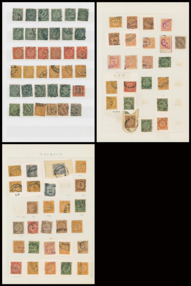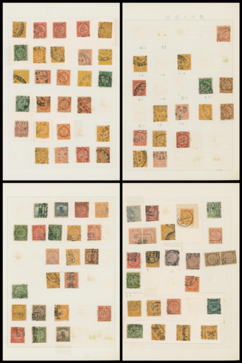 China 1897-1910 Coiling Dragon used stamps lot. They are classified according to the type of postmark. 4 leaves, 88 stamps used (Image1)