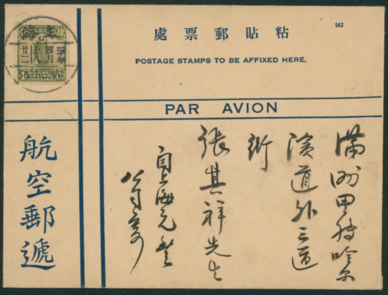 China 1931 Airmail envelope with Second Peking Print Junk 4c. stamp. single franking cancelled by datestamp in black 1931-04-18 Shanghai to Harbin transit :Manzhouli 1931-04-20 arrival :1931-04-22 Eurasia Aviation Corporation's 1st Shanghai-Manchouli test flight onboard cover. Domestic letter: 4c. (Airmail fee exemption) (Image1)