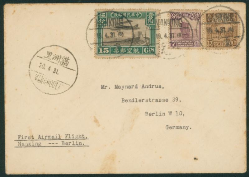 China 1931 Second Peking Print Junk 7c., 13c., Second Peking Print Air Mail 15c. cancelled by datestamp in black 1931-04-19 Nanking to Germany transit :Manchouli 1931-4-20 arrival :Berlin 1931-4-30 Eurasia Aviation Corporation's 1st Shanghai-Manchouli test flight onboard cover. (Image1)