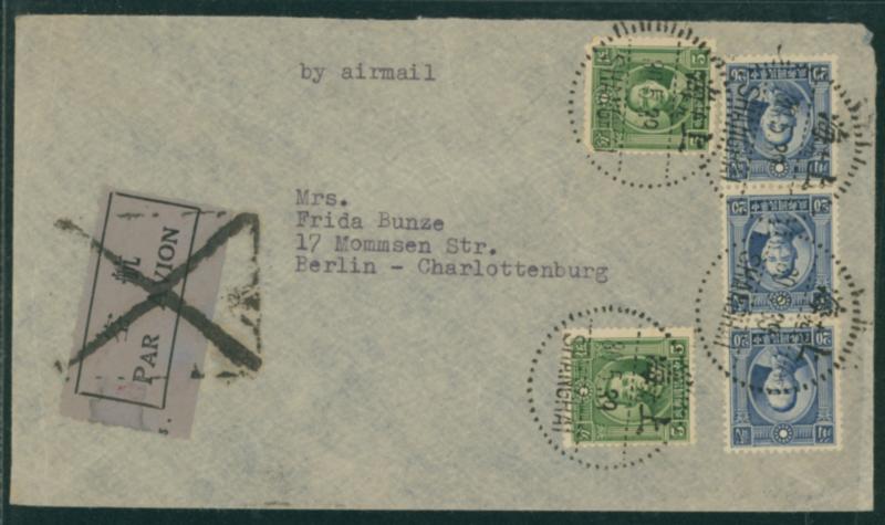 China 1934 Second Peking print Junk 8c. pair, First London Print SYS 20c., and Second Peking Print Air Mail 45c.(3) cancelled by datestamp in black 1934-04-02 Tenchowfu to Germany transit :Shanghai 1934-04-03 arrival :Essen 19314-04-27 Domestic flights, KLM overseas to Italy. Airmail for flight route to Italy (winter, 15g):$1.70(1c. overpaid) (Image1)