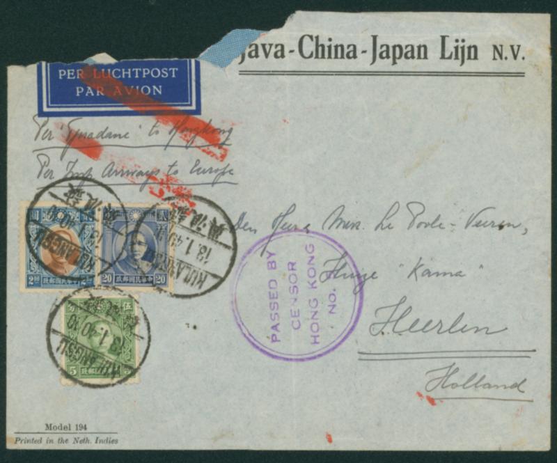 China 1940 First London print SYS 20c., Hong Kong Chung Hwa SYS first printing Die 1 $2, and Hong Kong Chung Hwa 5c. cancelled by datestamp in black 1940-01-13 Kulangsu to the Netherlands transit :Hong Kong 1940-01-15 Hong Kong's circular censorship stamp PASSED BY CENSOR HONG KONG NO.5. Hong Kong's circular censorship stamp is rare. London Airways cancel stamp included. The top left corner of the envelope is missing. Airmail to England or Europe(5g): $2.25 (Image1)