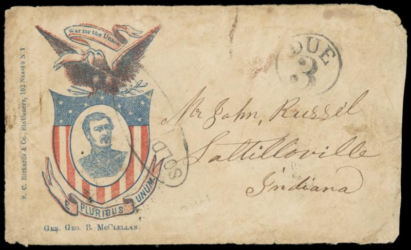 Symbol:General George B. McClellan. Portrait patriotic design surrounded flag shield and eagle on cover entering mails with "Cairo, Ill. May 20, 1863" backstamp to Saltilloville Ind., sent to the Dead Letter Office as unpaid letter, bold "Dead Letter Office, P.O. Dpt." double-oval backstamp along with partial "Soldier Letter" oval and "Due 3" in circle handstamps; flaws with wear and soiling, Fine and scarce Dead Letter Office Soldier's Letter,ex-Wegner. Estimate; $300 - 400.