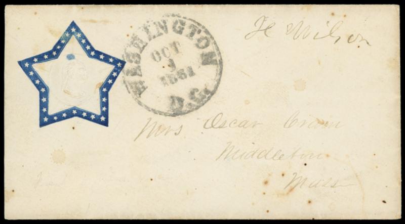 Symbol:Embossed Washington within Star. Blue patriotic design on cover with "H. Wilson" Congressional free frank, entered mails with "Washington D.C., Oct 1, 1862" cds to Middleton Mass., original soldier letter from Oscar Crain to his wife reading "…We are under marching orders but don't know when we shall go away, but they are having good times. The other side of the (Potomac) river they have now & then a brush with the rebels, They now & then have a brush with the revels & I expect soon they will have quite a time. I hope they will soon settle this business up for it is getting cold weather now…"; some age spotting, otherwise Very Fine. Estimate; $150 - 200. US$150-200 (Image)