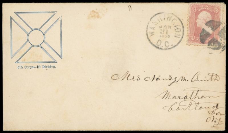 Symbol:5th Corps - 2d Division. Blue Maltese cross patriotic design with Clagston flap imprint on buff cover bearing 3¢ rose (65), perf flaw, tied by quartered cork duplexed with "Washington D.C., Jan 31, 1863" cds to Marathon N.Y., F.-V.F. and scarce regimental design. Estimate; $150 - 200. US$150-200 (Image)