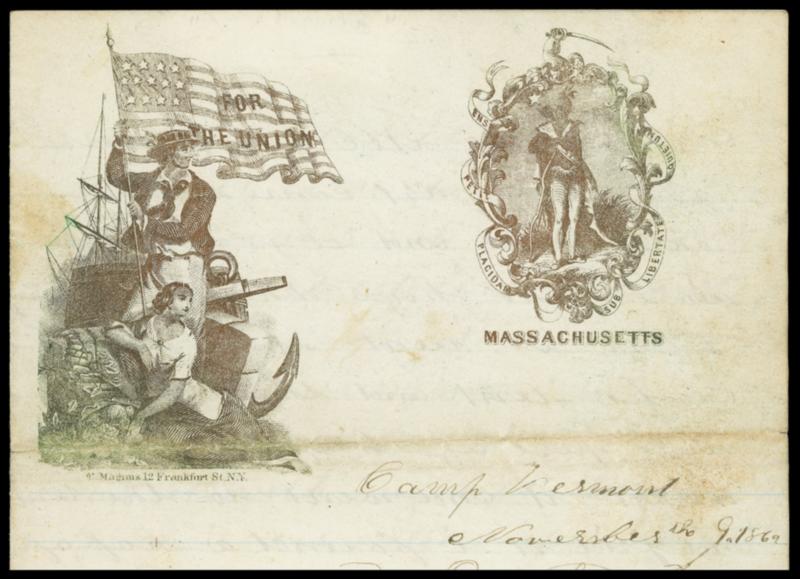 Symbol:For the Union, Massachusetts. Bronze Magnus two-panel patriotic design showing Sailor & Female and State Seal on lettersheet datelined "Camp Vermont, November Nov the 9th 1862" letter from soldier to his brother including some military content"……"; some fold wear and soiling just affecting design; file folds, Fine. Estimate; $150 - 200. View a PDF of images for this lot US$150-200 (Image)
