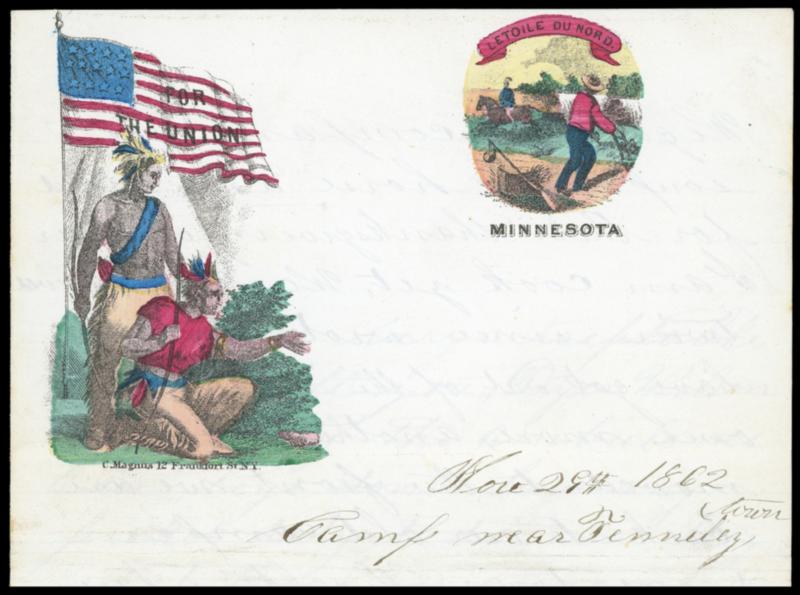 Symbol:For the Union, Minnesota. Multicolor Magnus two-panel patriotic design showing Two Indians and State Seal on lettersheet datelined "Nov 29th 1862, Camp near Tennalytown" letter from soldier to his sister including some military content"…we have got out of hte wilderness once more, another Regt. have moved to the front we are back to our old camp on George Town Heights where we was when we first camped in Dixey…We expect to go into winter quarters here…"; bold coloring; file folds, Very Fine and choice example of this desirable patriotic design. Estimate; $300 - 400. View a PDF of images for this lot US$300-400 (Image)