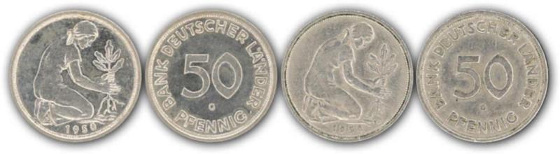 BDL: 1950, 2 Stück 50 Pfennig 1950 G, eins in ss, eins in vz (Image)