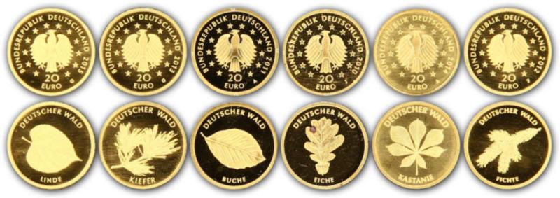 DEUTSCHER WALD: 2010/2015, 6 Goldmünzen "Deutscher Wald" im originaler Holzbox mit Zertifikaten, je 1/8 oz 999,9 Gold (Image)