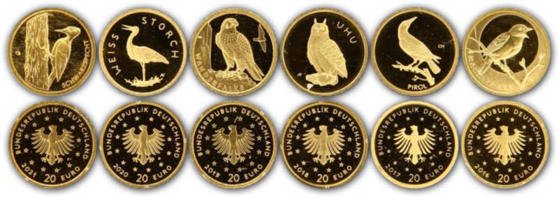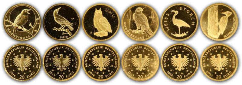 HEIMISCHE VÖGEL: 2016/2021, 6 Goldmünzen "Vögel" im originalen VfS Blister mit Zertifikaten, je 1/8 oz 999,9 Gold (Image)
