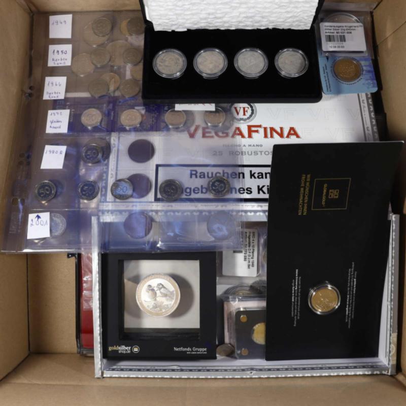 WUNDERKISTE: 1875/2010 ca., Stöberkiste, u.a. 50 Rpf. 1928 A Nickel, 3 Stück 2 RM Kirche mit Datum, 2 Stück 5 RM Kirche mit Datum, 2+5 RM Luther, 2+5 RM Schiller, weitere 2 und 5 RM, Pfennigsammlung BDL, 1 Reichspfennig 1945 F + 1946 F o.HK, 9 verschiedene 5 und 10 Reichspfennig o.HK, 1 Pfennig (BRD) Fehlprägung ohne Jahreszahl mit fehlenden Buchstaben, einige Rubelstücke CuNi, DDR KMS 1979, vergoldete Euro, Baden 3 Mark 1909 ss, Kookaburra 2013 - 1 oz Silber (Image)