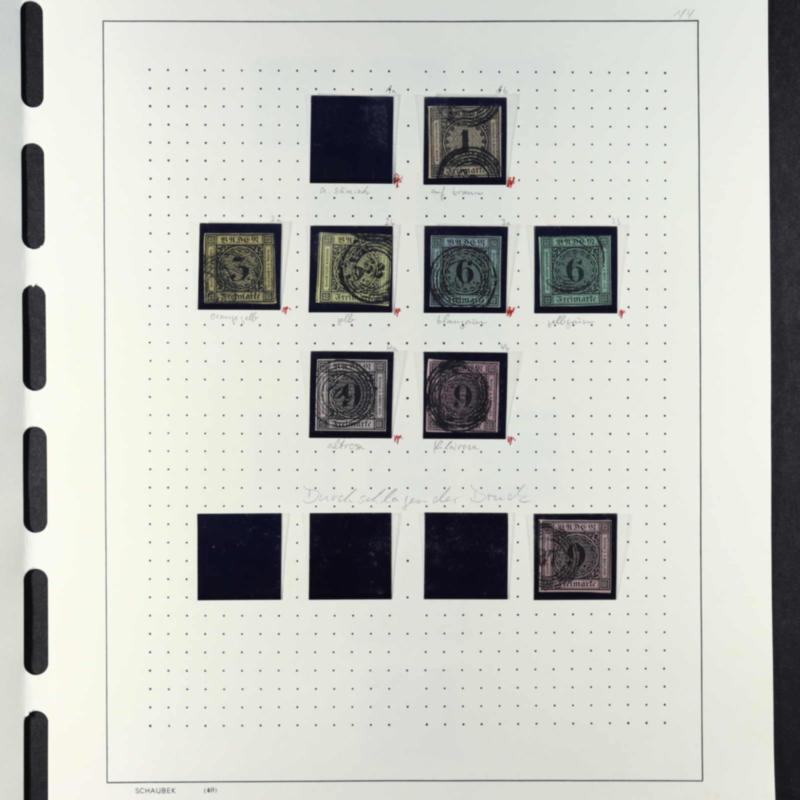 BADEN: 1851/68, gestempelte Sammlung auf Blanko-Albenseiten, nicht komplett, jedoch etliche bessere Werte enthalten, u.a. Mi-Nr. 1 b, 3 a, 4 a, 11 a/b, 12, 13 a+c, 14 b (2), 15 a-c inkl. ba und 16, dazu viele Plattenfehler, durchschlagender Druck, Druckzufälligkeiten und sonstige Abarten wie fehlende Zahnlöcher, teils unberechnet, vieles ist geprüft bzw. mit Fotobefund oder Kurzbefund versehen, meist gute Qualität, Katalogwert weit über 6.000 Euro (Image)
