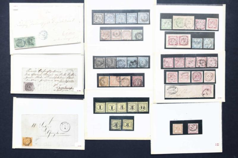 BAYERN: 1849/1911, gemischter Posten, überwiegend gest., einige Werte auch auf Briefstücken, dabei Mi-Nr. 2 I/II, 4 I/II, 5 vielfach mit einer gest. Bogenecke von oben links, 6, 7, 11/13, teils mehrfach, div. Wappenausgaben, etwas Luitpold und eine gest. P 1, einige Werte sign. Pfenninger, enorm hoher Katalogwert, überwiegend gute Qualität (Image)