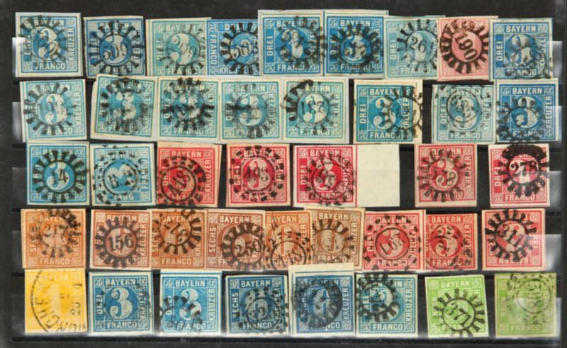 BAYERN: 1849/62, 41 Werte Quadratausgaben 1 bis 9 Kr. gestempelt, überwiegend geschlossene Mühlradstempel mit verschiedenen Nummern, dabei bessere wie gMR 156, 321, 500, 503, 509 und 578 sowie oMR 685, auch Randstücke, meist gute Qualität (Image)