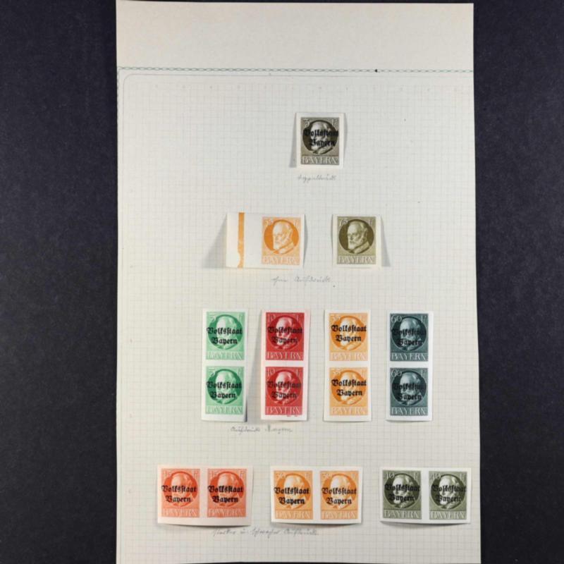 BAYERN: 1911/20, postfr. Bestand aus Mi-Nr. 71 bis 195, in den Hauptnummern nicht kpl., dabei aber zahlreiche Besonderheiten, teils in Einheiten, u.a. 6 ungez. Werte aus Mi-Nr 77/91, Mi-Nr.104 P ungez. im postfr. 8er Block in orange aus der rechten oberen Bogenecke, Nr. 163 im 15er Block postfr. ohne Aufdr., und Nr. 195 U im kpl. Bogen zu 20 Werten, die wichtigen Werte sind meist sign. Brettl, Bühler usw., dazu einige ungebr. Postkarten und Postanweisungen, auf Steckkarten, hoher Katalogwert, saubere Qualität (Image)