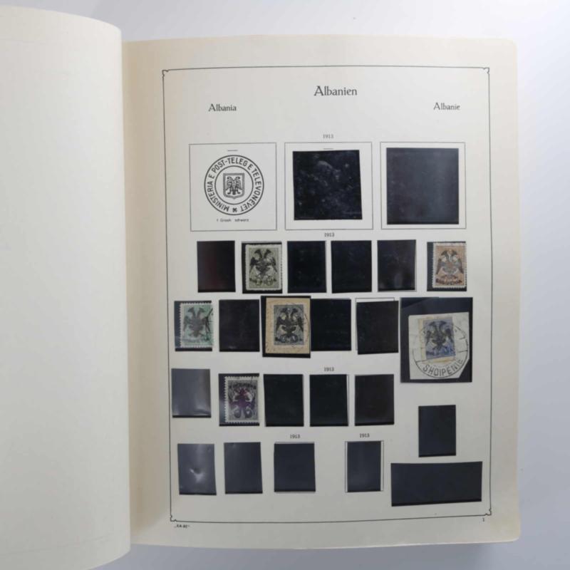 ALBANIEN: 1913/87, gemischte Sammlung, überwiegend gestempelt, etwas ungebraucht oder postfrisch, in den Hauptnummern nicht kpl., dabei aber zahlreiche gute Einzelwerte und kpl. Ausgaben, beginnend mit einigen Werten der Handstempel auf türkischen Marken, teils sign., div. Ausgaben mit Dienststempeln und viele Überdruckausgaben der Vorläufigen Verwaltung, dazu schöner Teil Lokalausgaben mit Ausgaben von Korca, Essad-Post und Shkodra, die Ausgaben der Republik ab 1925 sind überwiegend gest., mit fast allen guten Ausgaben der 20er bis 40er Jahre, es fehlen nur die Flugpostausgaben von 1928, 1930 und 1953, dazu alle Blocks, inkl. Bl. 1 bis 4 und 15,16 gest., abgeschlossen wird die Sammlung mit einem schönen Teil Portomarken, im Vordruckalbum und in einem E.-Buch, eine reichhaltige Sammlung, hoher Katalogwert, gute Qualität, bitte besichtigen (Image)