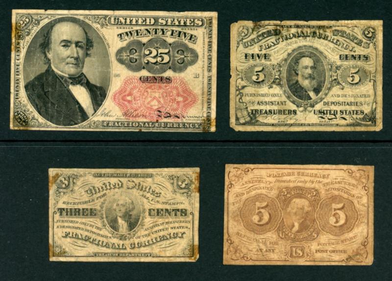 Postage and Fractional Currency, 4 Pieces - Includes fractional currency 3c, 5c, and 25c, and Scott PC5 postage currency. All pretty rough condition. (Est $50-70) (Image)