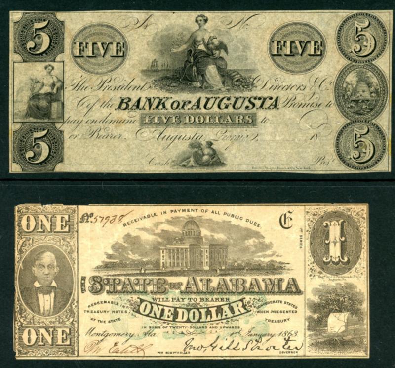 1860's Obsolete Currency Confederate Paper Money, 2 Items - State of Alabama $1 Confederate State currency dated 1863 (Some edge faults), and Bank of Augusta $5 unused bank currency. AU condition. (Est $40-60) (Image)