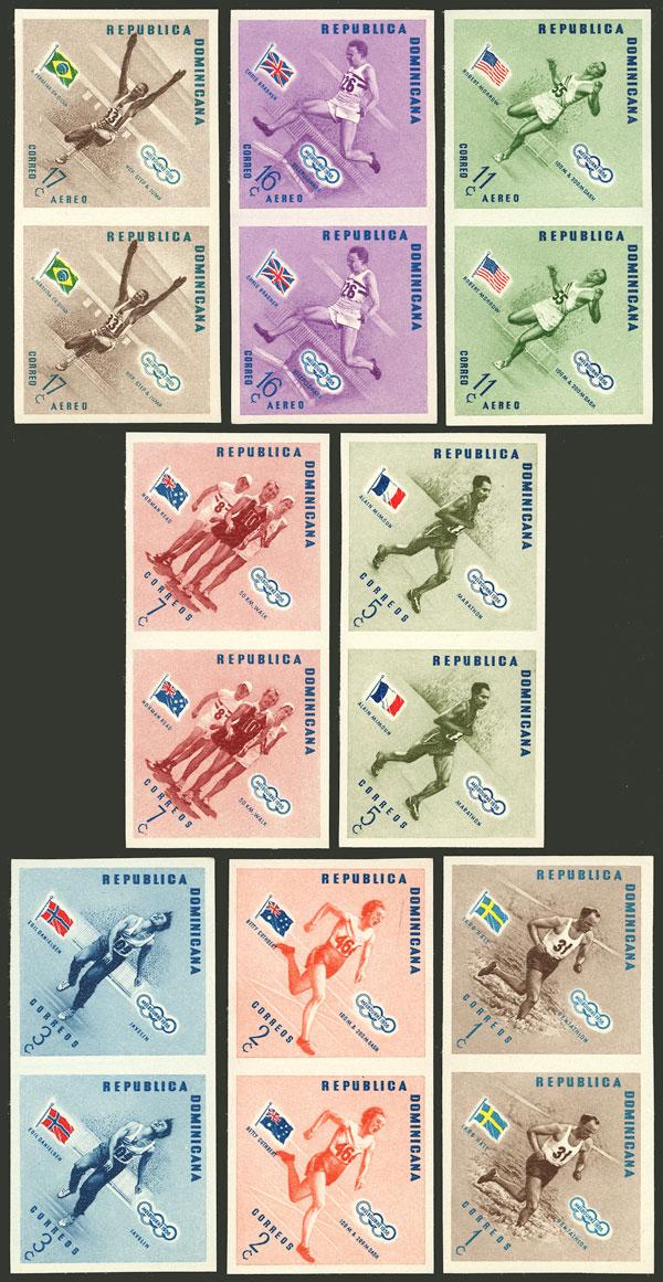 Yvert 444/448 + A.101/103, 1957 Melbourne Olympic games, set of 8 IMPERFORATE PAIRS, MNH (a few examples with a small stain spot on the gum), very nice! (Image)