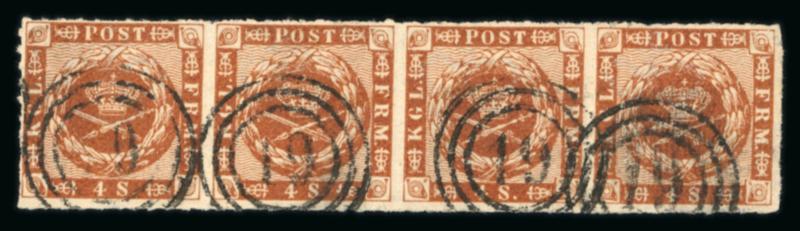 1863 4s rouletted strip of four cancelled by numeral 19 (Frederikshavn), a scarce and very fine strip in fresh and flawless condition, plus 1851 wrapper with 4rbs imperf. (Image)