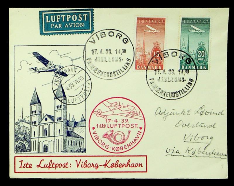 Denmark 1939 2v on First Flight Airmail cover from Viborg to Copenhagen & return (Image)