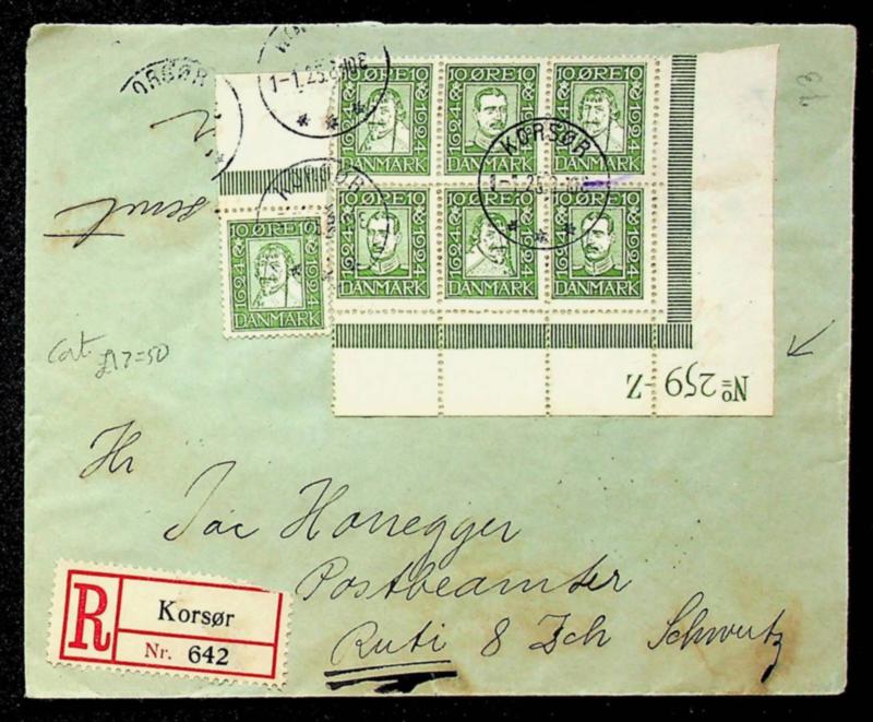 Denmark 1925 10o corner block of 6 w/ plate+ single on Regd cover from Korsor to Ruti Switzerland (Image)