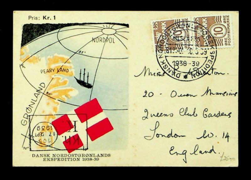 Denmark 1938-39 Danish Northeast Greenland Expedition postcard w/ 10o pair to London England (Image)