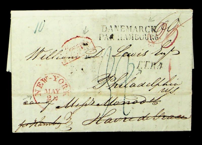 Denmark 1829 prestamp cover w/ "Price Current" Printed list from Copenhagen via Germany to France redirected to USA w/ New York 2 Forwarding Agents seals (Image)