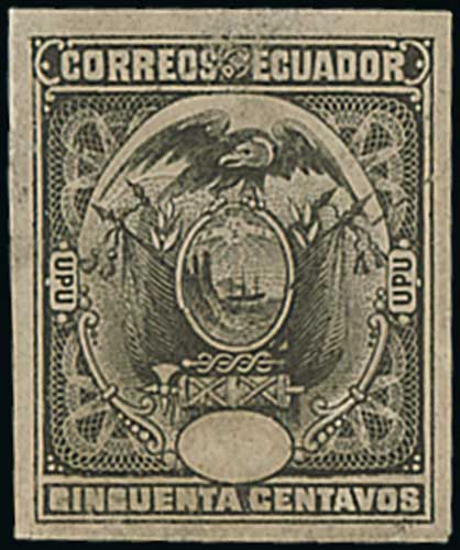 1899 Waterlow issue, working master die proofs in black of the 10c and 5s frames, and the seven vignettes used for the 1c - 50c and 5s, all with the die number written above (the two frame proofs with a second number erased and punch holes), a few faults but unique. Also 1899-1901 sample stamps with "Waterlow & Sons Ltd / Specimen" overprints in various issued or unissued colours comprising imperf singles (9), perforated singles (8) and sheets of nine (6 sheets); similar imperf sample proofs without overprint (9); printers file stamps with punch holes in blocks of four (20), ten (20) or sixteen (4, official stamps) most with marginal endorsements showing order numbers, dates and quantity (no gum, a few faults); 1c black and dull blue mint pair and strip of three imperforate vertically; and 5c black and carmine block of ten with "AR" cancels. (448). Photo on Page 214. (Image1)