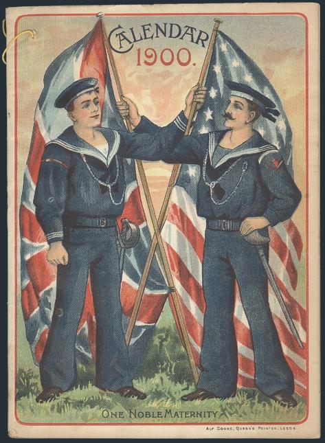 CALENDAR ALMANAC 1900: Fascinating 33 page Calendar Almanac booklet (4.5 x 6.25 in) for 1900. Has gorgeous coloured outside cover depicting American & British sailors with flags plus White House & Windsor Castle on reverse. Inside has all kinds of interesting printed articles. F (Image)