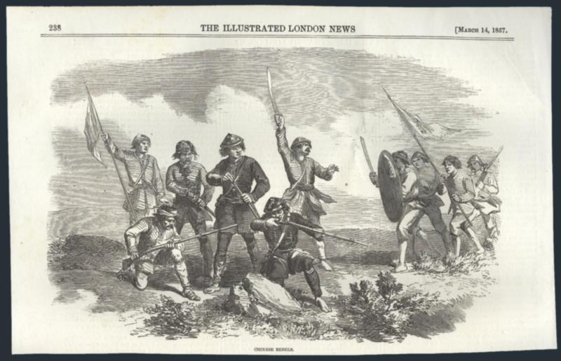ENGRAVED PRINTS OF CHINA FROM THE OPIUM WARS: Fascinating collection of 37 old b/w prints of the CHINESE OPIUM WAR era. These are prints that appeared in the "1857 Illustrated London News". Lots of interesting & unusual scenes incl Chinese Pirate Boat at Canton; scene of Port of Shanghai; Chinese Smuggling Boat; Bombardment of Canton; Capture of French Folly Fort; Chinese carrying wounded; attempt to Capture the Passenger Steamer "Fei Ma" by 53 Imperial Junks; Chinese men & women; preparing raw silk; merchant boats; Chinese buildings; Hong Kong trial at Police Station; Chinese War Junks; etc. F (37 items) (Image)