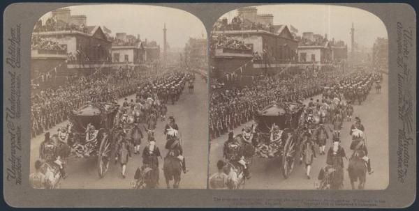 STEREOSCOPIC CARDS: Scarce lot of 30 diff b/w STEREOSCOPIC CARDS depicting scenes from the 1902 CORONATION OF KING EDWARD VII. Each Stereoscopic card has a pair of separate images depicting left-eye and right-eye views of the same scene. When inserted in a Stereoscope viewer they provide a single three-dimensional image. The scenes depicted in this lot incl the Coronation Procession, Coronation events, decorated London Streets, Canadian Coronation Arch, Canadian Military Coronation Contingent, Heads of State of the British Empire (incl Sir Wilfrid Laurier), etc. The cards were made by Underwood & Underwood. Mainly F-VF. NICE COLLECTIBLES (Image)