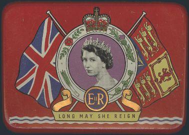 QE 1953 CORONATION SOUVENIR: Very attractive small red illustrated tin box compliments of OXO Canada, Ltd. Montreal. Depicts QE, Union Jack, Royal Standard, etc. "Long may she Reign". VF (Image)