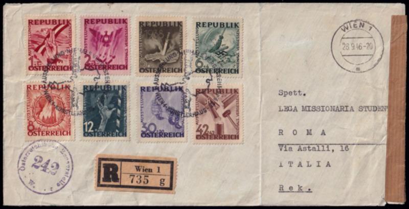 1946 AUSTELLUNG - NIEMALS VERGESSEN. Mostra antifascista di Vienna del 1946, la serie di 8 francobolli e busta raccomandata con la serie completa spedita in Italia in data 28/9/1946 (timbro di arrivo. Ex collezione Egidio Errani. (Image)