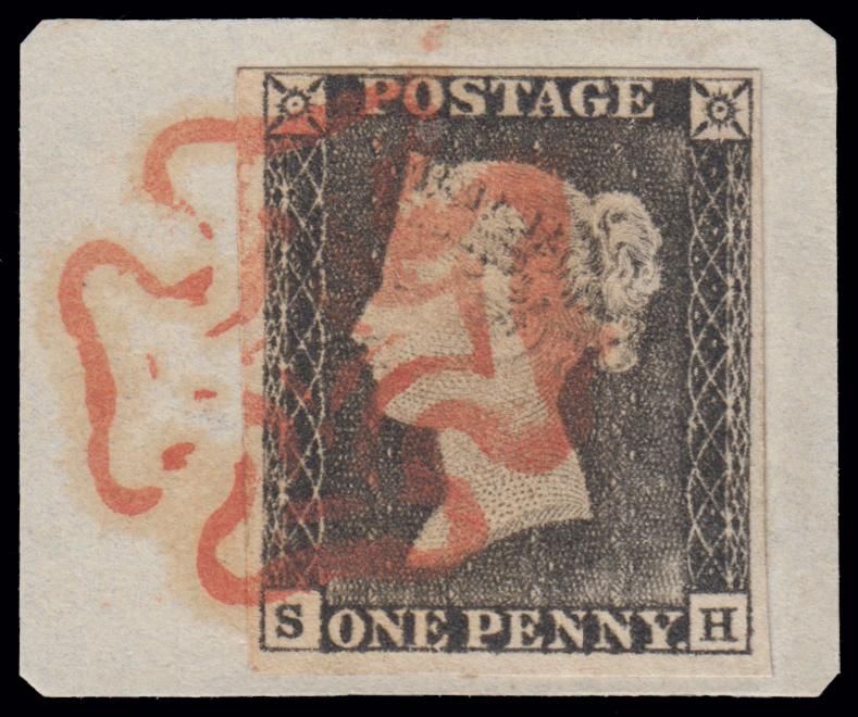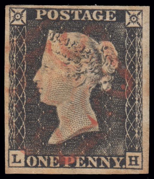 Q. VICTORIA 1d.. Plate 1a, letters LH, used with red Maltese Cross, 4 good even margins (SG. 1). (Image)