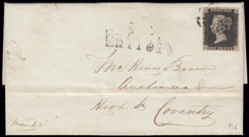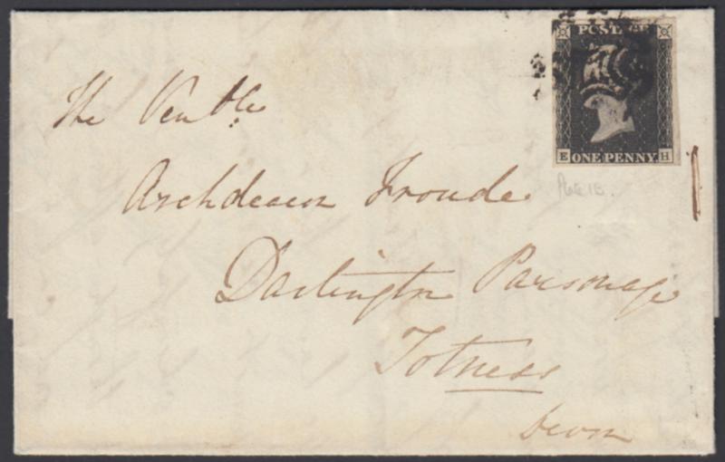 Q. VICTORIA 1d.. Plate 1b, letters EH, on written cover to Totnes with black Maltese Cross, 4 margins good to huges (SG. 1). (Image)