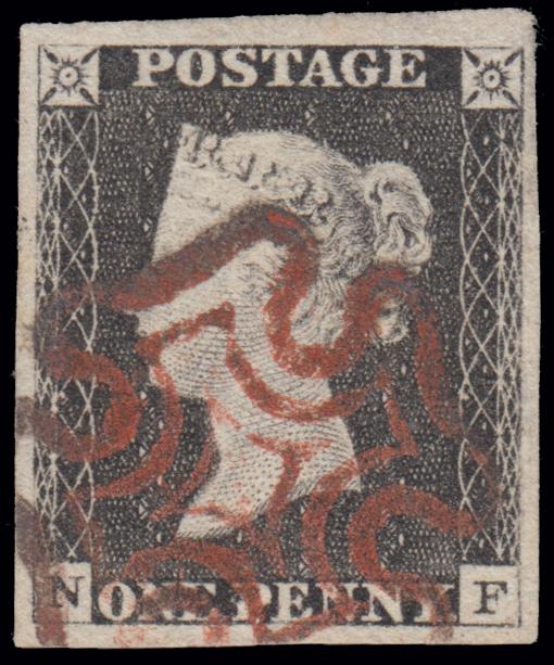 Q. VICTORIA 1d.. Plate 3, letters NF, used with uncommon reddish-black Maltese Cross, 4 good to enormous on top margins (SG. 1). (Image)
