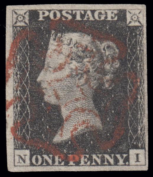 Q. VICTORIA 1d.. Plate 1b, letters NI, used with perfect centered and lightly impressed red Maltese Cross, 4 good to huge margins (SG. 1). Superbe. (Image)