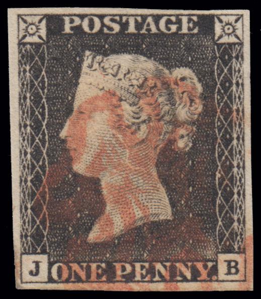 Q. VICTORIA 1d.. Plate 1a, letters JB, used with red Maltese Cross, 4 margins good to huges (SG. 1). (Image)