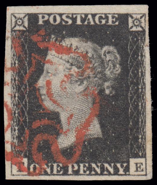 Q. VICTORIA 1d.. Plate 1a, letters LG, used with red Maltese Cross, 4 margins good to huges and the face of the Queen clear(SG. 1). (Image)