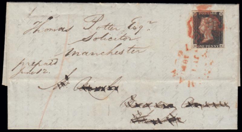 Q. VICTORIA 1d. - REDIRECTED COVER. Plate 2, letters BK, 4 margins good to huges (SG. 1), used on cover from Manchester June 11 1840 with red Maltese Cross cancellation and redirected to Manchester the day after, "prepaid June 12" written on the left. Very fine. (Image)